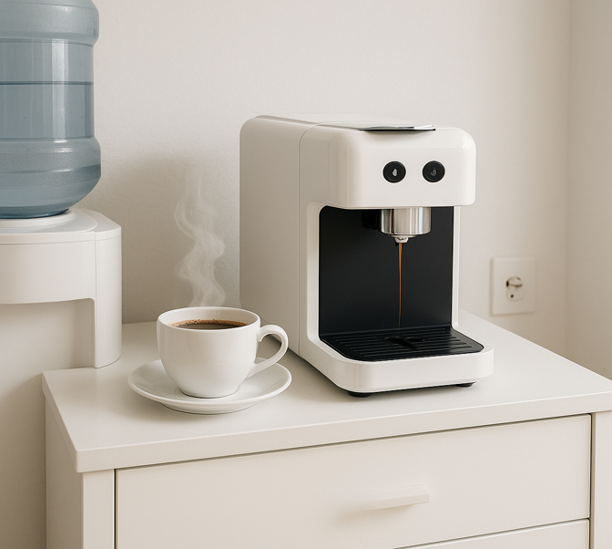 Access to a coffee machine, refrigerator, and water cooler.